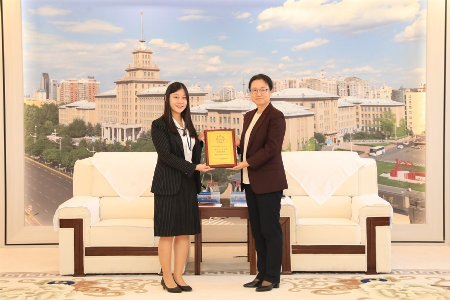 副校长、哈工大教育发展基金会副理事长孙雪分别向宗润福校友和沈阳芯源微电子设备股份有限公司颁发捐赠教育贡献奖奖牌和捐赠证书。